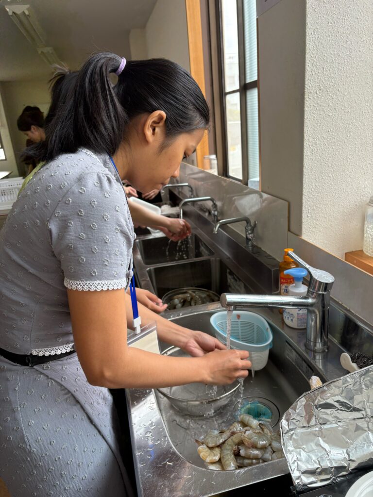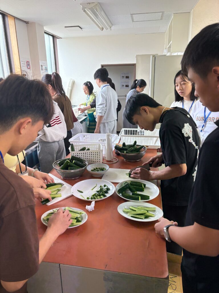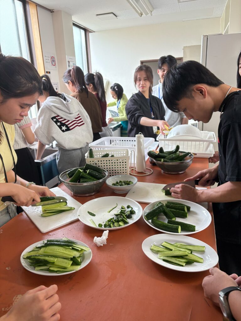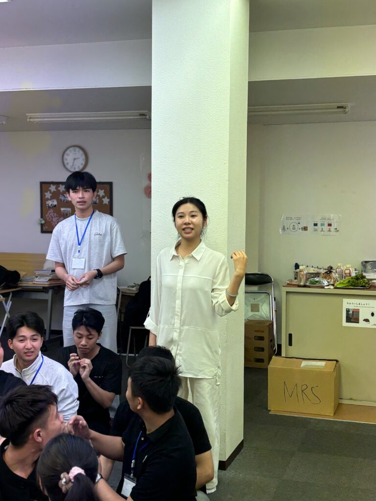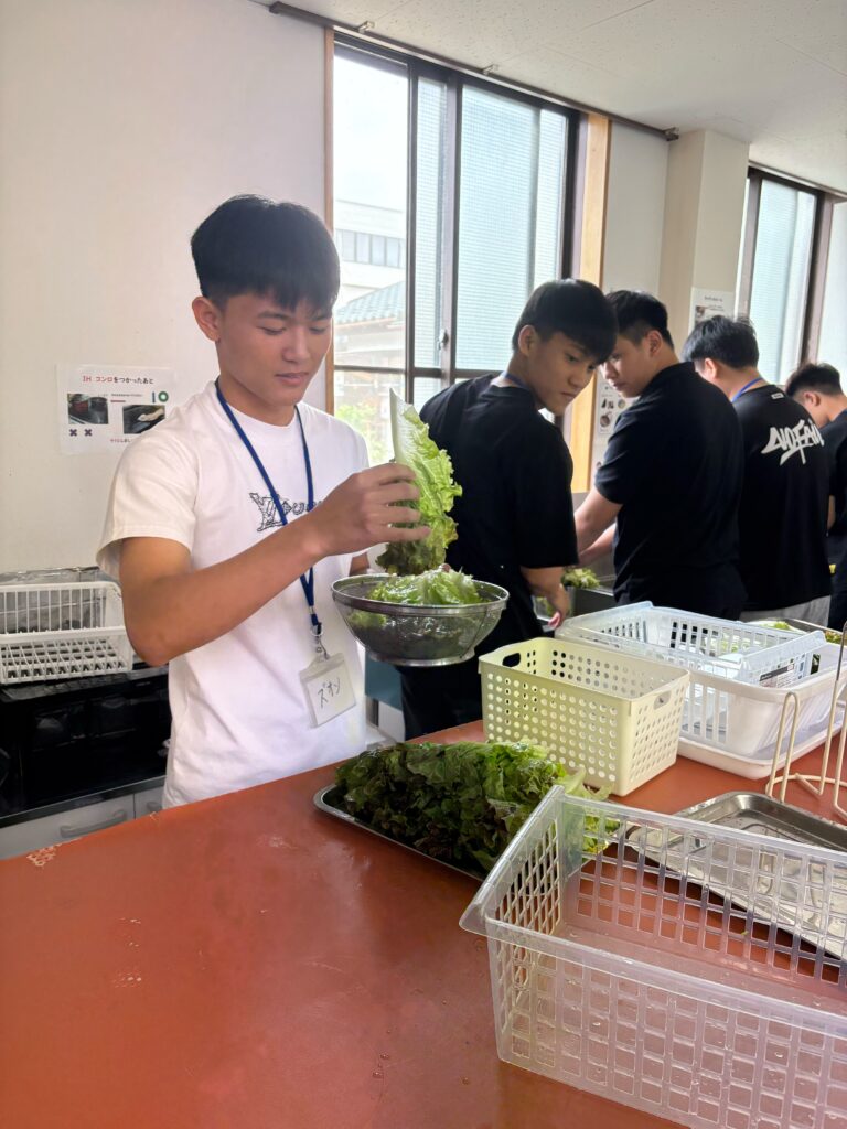 食事しながら、野菜、果物などの言葉も勉強しました。実習生と積極的コミュニケーションをとりました。