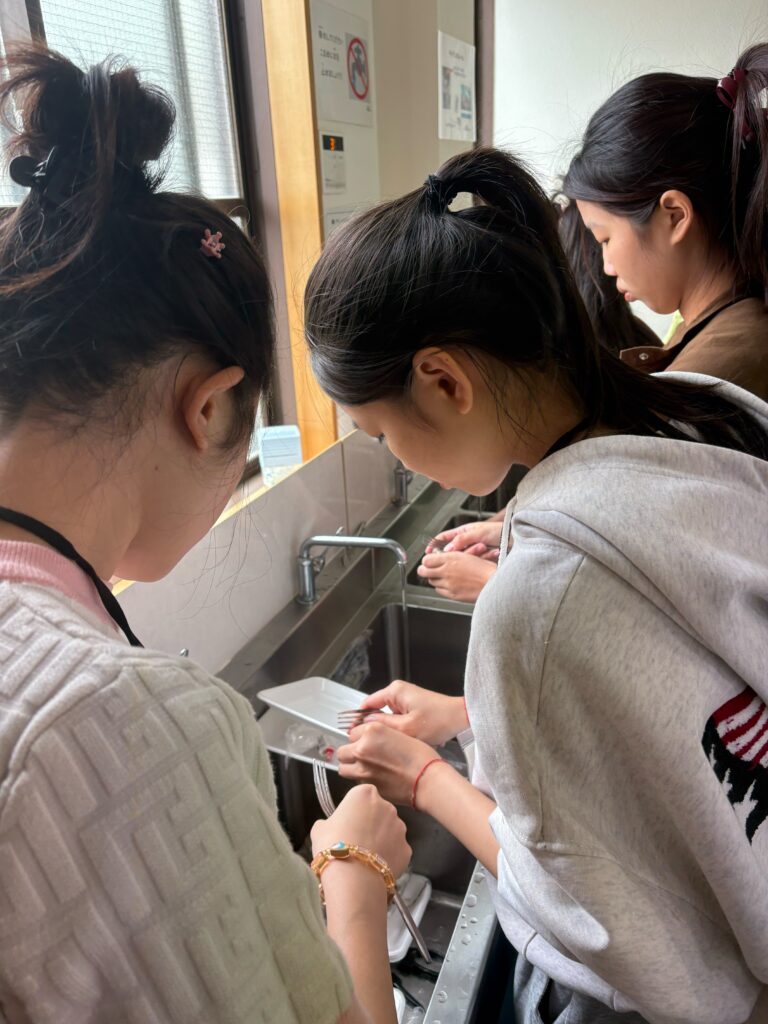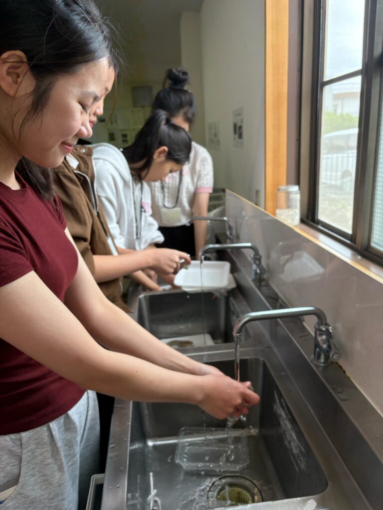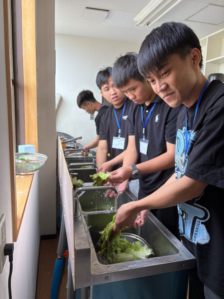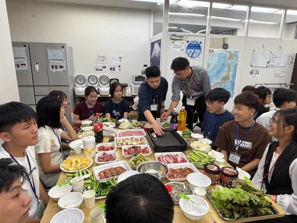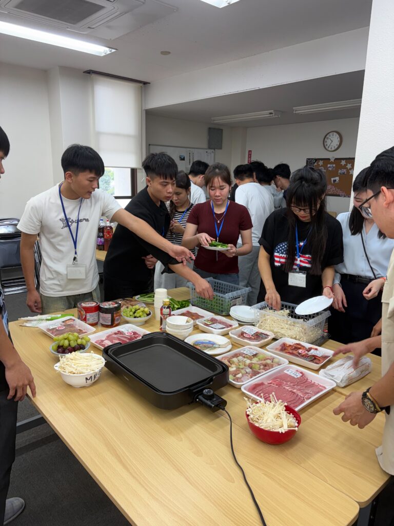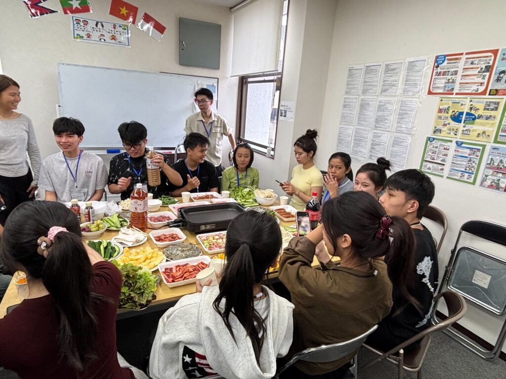 食事しながら、野菜、果物などの言葉も勉強しました。実習生と積極的コミュニケーションをとりました。